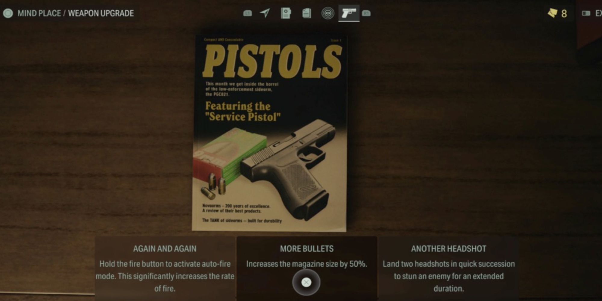 - More Bullets-- increases pistol capacity by 50%. Requires 12 fragments.