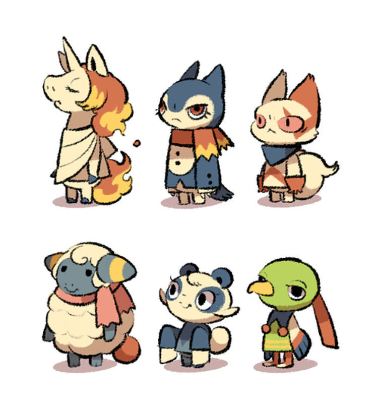 Luce-do-the-doodles is at it again with these adorable crossover characters. In order we have Rapidash, Quilava, Zangoose, Mareep, Pancham, and Xatu. We love their faces! Zangoose looks like they are having war flashbacks and Pancham looks like she is plotting a sinister crime. Rapidash looks like they are loosely based on the unicorn villager, Julian, because like Julian, they are looking pretty smug.