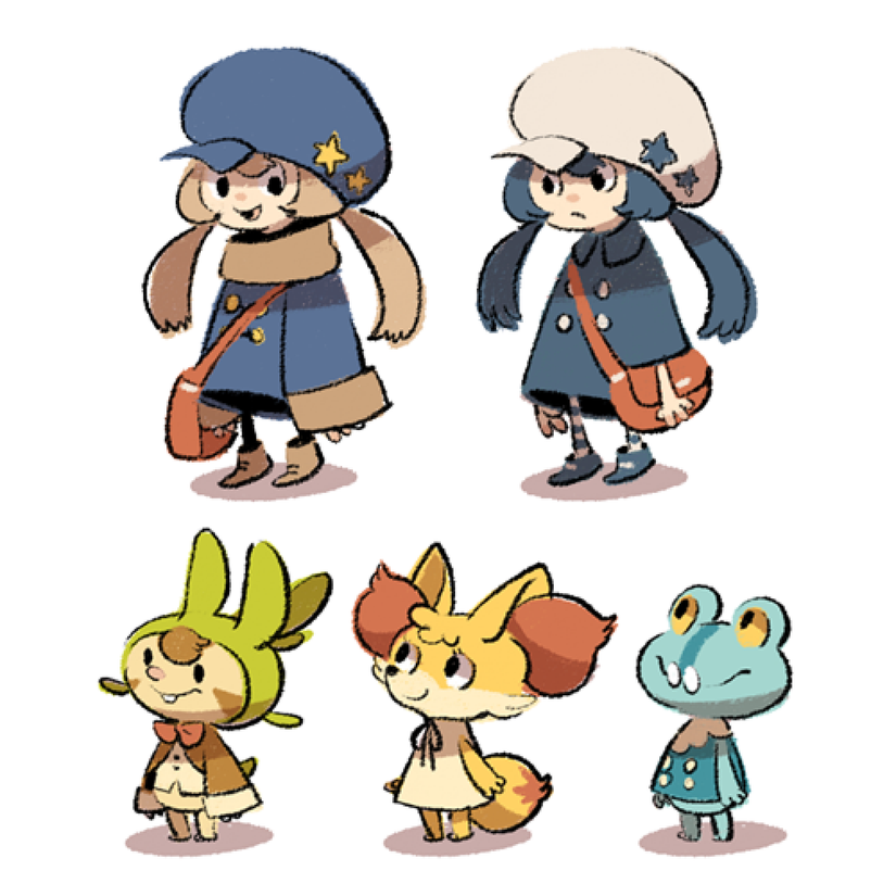 Luce-do-the-doodles has also done human characters, except they do not appear to be based on any particular character in either series. Maybe these two are loosely based on the protagonist of the X and Y games? The reason we think so is because the three Pokémon villagers below them are starters from the X and Y games. They are Chespin, Fennekin, and Froakie.