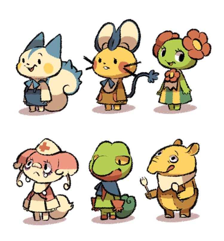 In order we have Pachirisu, Dedenne, Bellossom, Audino, Treeko, and Drowsy. Luce-do-the-doodles decided to get a little creative and make Audino a nurse and give Drowsy some cutlery. There are Animal Crossing villagers that have some unique traits that separate them from others. For example, Kid Cat has a helmet and and Anka wears a crown. Even when villagers like those put on new outfits, those details remain the same.
