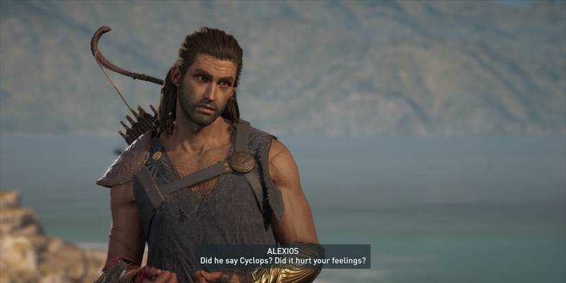 With, Alexios, this line comes with much more mocking and playground-esque teasing. Not only does this make the moment funny, but it also becomes a lot more satisfying when Alexios disposes of the Cyclops's eye. Although the goat didn't really deserve it!