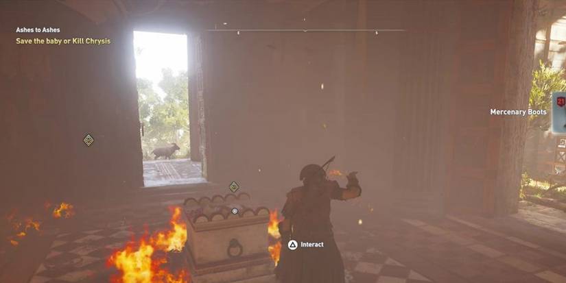 There's a questline pretty late in the game called Ashes to Ashes where our protag tracks down one of the Worshippers of the Bloodline named Chrysis who is a real bad egg. After exhausting her dialog, Chrysis attempts to escape after setting the room on fire. Players will then be faced with a choice, chase after Chrysis or save the baby she left to burn.