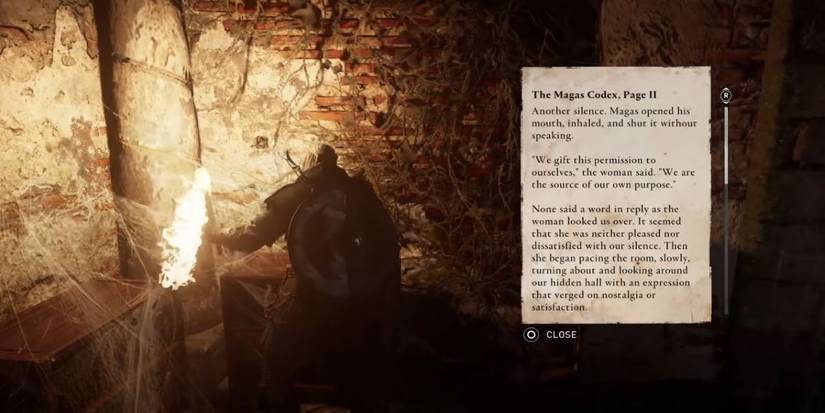 The Magas Codex was a six-page collectible in Assassin's Creed Valhalla which rewards players with parts of the armor set. Each page describes a conversation between the assassins Magas and Hakor in the Alexandrian bureau and an assassin in her 50s. The Codex describes the ironies and the three tenets assassins must follow.