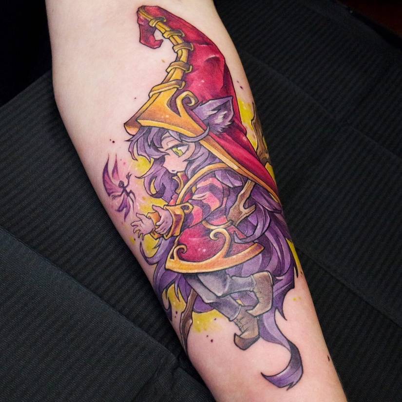 What better way to depict the energetic support champion Lulu than with splashes of color? This Lulu tattoo by Zsofi at Dark Art Tattoo in Hungary doesn't shy away from Lulu's bright purple hair or pink and gold robes.