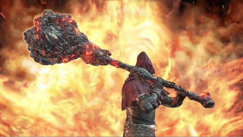 Gained by transposing the Soul of the Old Demon King, this burning behemoth is one of the ideal ways to simultaneously scorch and smash all who stand against the Ashen One. It deals split damage, though greatly favors physical striking over the firey kind. With the right investment, however, the Old King's Great Hammer can do satisfying amounts of both.