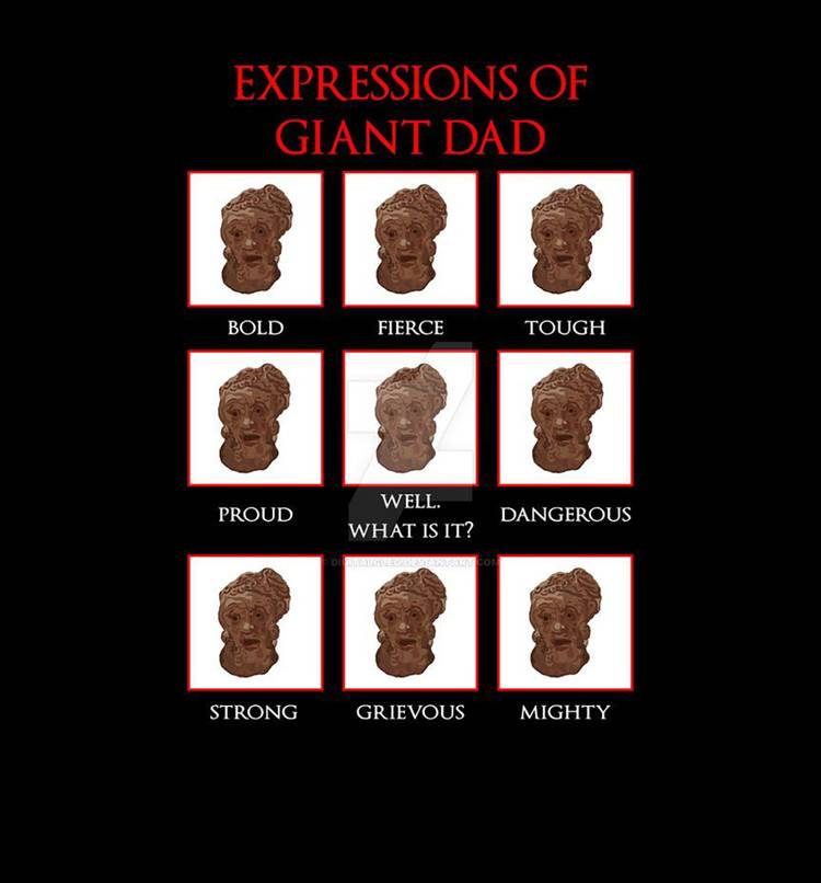 However, upon close inspection, people realize that it just looks like a regular character cosplaying as Giant Dad. But it is the request of Giant Dad not to be deceived by the looks because looks are subjective, while the overpowering build is a fact.