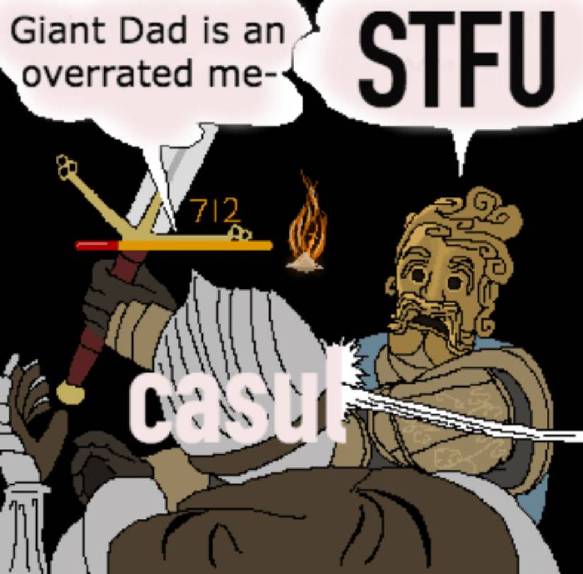 Talking about a slap in the face, here's one for everyone who thinks Giant Dad isn't a good meme. How dare one commit such treachery. This is how Giant Dad and his descendants perceive the world. Pick a Zweihander, kill everything and everyone by being a human version of a tank. Anyone who thinks otherwise is probably too afraid to drive a tank. Those are the people Giant Dad thinks of as absolute casuals. And that's the bottom line, cause Giant Dad thinks so.