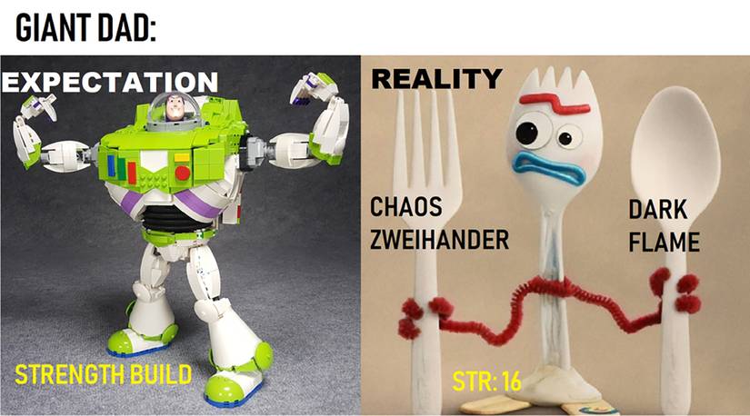 This is a pretty smart meme, as it incorporates the poster of The Godfather into Giant Dad. However, the best part is that it is the symbolism that fits the character. Giant Dad is supposed to be a build that almost everyone can use to their benefit. There might be a lot of people who call the Giant Dad character build a griefer thing, but no one can deny the sheer usefulness of it.