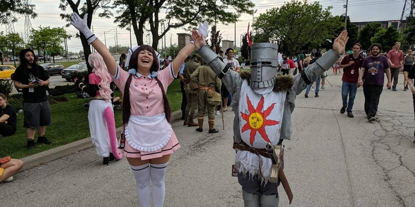 Another crossover between two different worlds, this one is posted by supersoftly on deviantart.com. The cosplay is unique and apt at the same time. Both the costumes looked on point and built with dedication—especially Solaire, with individual modifications that bring out the modern factor. On an emotional level, this one looks like how Solaire would want his family painting to be. This is jolly cooperation, and everything indeed looks jolly, until you notice the eyes of the sun.