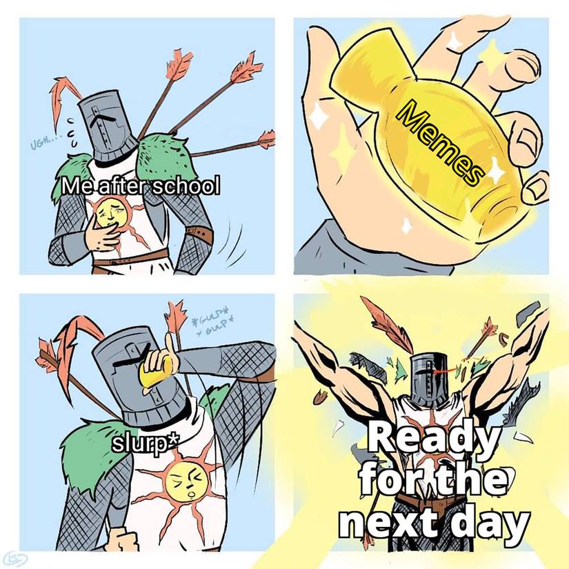 Almost true for anyone reading memes right now. People do things in their lives that help them feel better. Many of them exercise, others go out with friends or play video games, and then there are some who just read and share memes with each other. Where, every meme is like chugging on Estus Flask, one by one, recovering the mood. And who are we to judge. If something this harmless works in making life better, go ahead and do it. Nobody will stop.