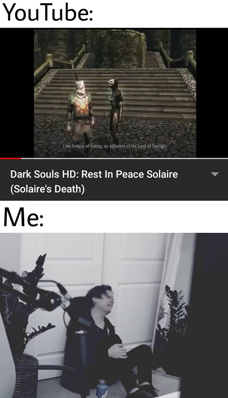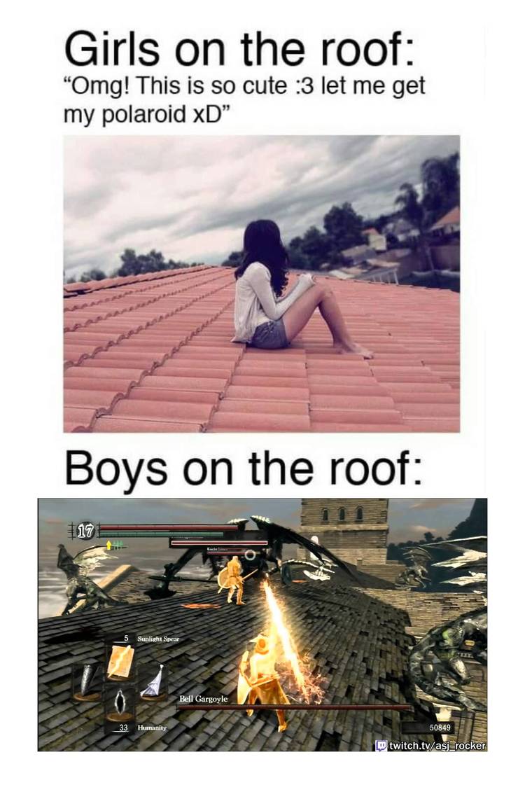 While girls vs boys memes are the oldest concept, it is still somewhat funny. The Bell Gargoyle boss fight with Solaire on the side has been one of the best parts of the Dark Souls. As it is the first time players team up with Solaire. The rooftop fight isn't just a fun boss fight, but it is a highly emotional one as well.