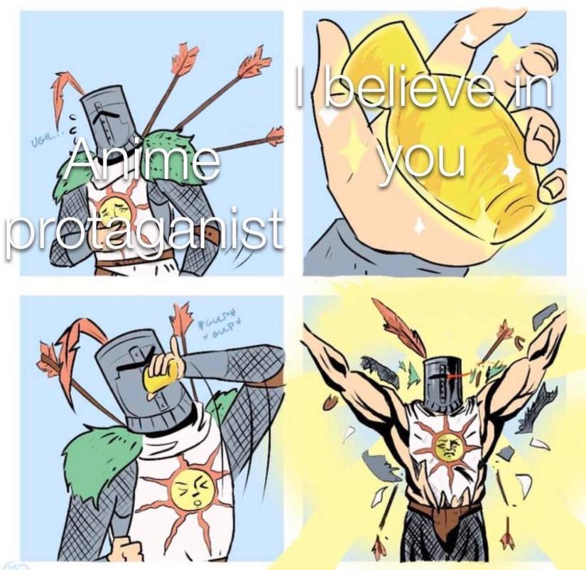 The little comic above is factual to Dark Souls, as it shows how ridiculously good players feel once they've chugged on a couple of Estus Flasks. Because low health in Dark Souls almost always means imminent death, but for some reason when the health is over half, it feels like no enemy is anything. Well, this is kind of equivalent to someone putting their faith in the main protagonist, during a big fight scene in an anime. Remember how every time Goku makes a comeback in Dragon Ball Z? That is this.