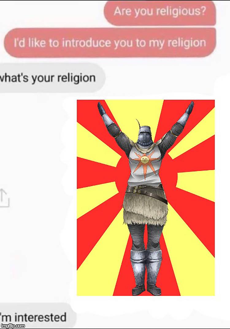 People always have these weird chats with their friends and families, with droplets of information that only they can decode. This meme is similar to that in regard. Because to anyone outside the Dark Souls domain, this would sound like someone trying to convert a person to religion. But in fact, this is just two Sun-Bros communicating their love for the solar giant. Because they understand the reality of this world, they know that all that is left is to "Praise The Sun."