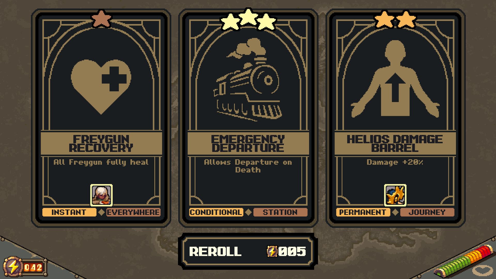 After each successful station, choose from special Reward Cards that grant unique perks and boosts. Craft unique builds by mixing cards with your evolving crew for creative new strategies.