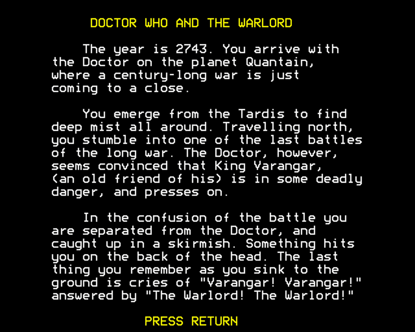 Doctor Who and the Warlord is a text-based adventure for the BBC Micro. It was the second officially-licensed game for the Doctor Who franchise. Players take on the role of one of the Doctor's companions as they travel through space and time, going from a strange alien world all the way to the Battle of Waterloo.