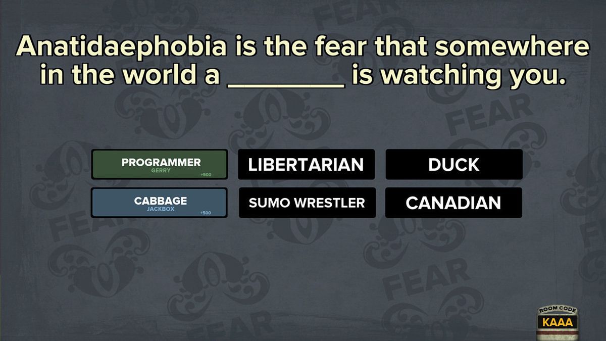 Fibbage is a trivia bluffing game from You Don’t Know Jack. Instead of answering correctly, players create fake answers to fool others while guessing the truth. Hosted by Cookie Masterson, it supports up to eight players using phones, tablets, or laptops as controllers, making for a hilarious and competitive experience.