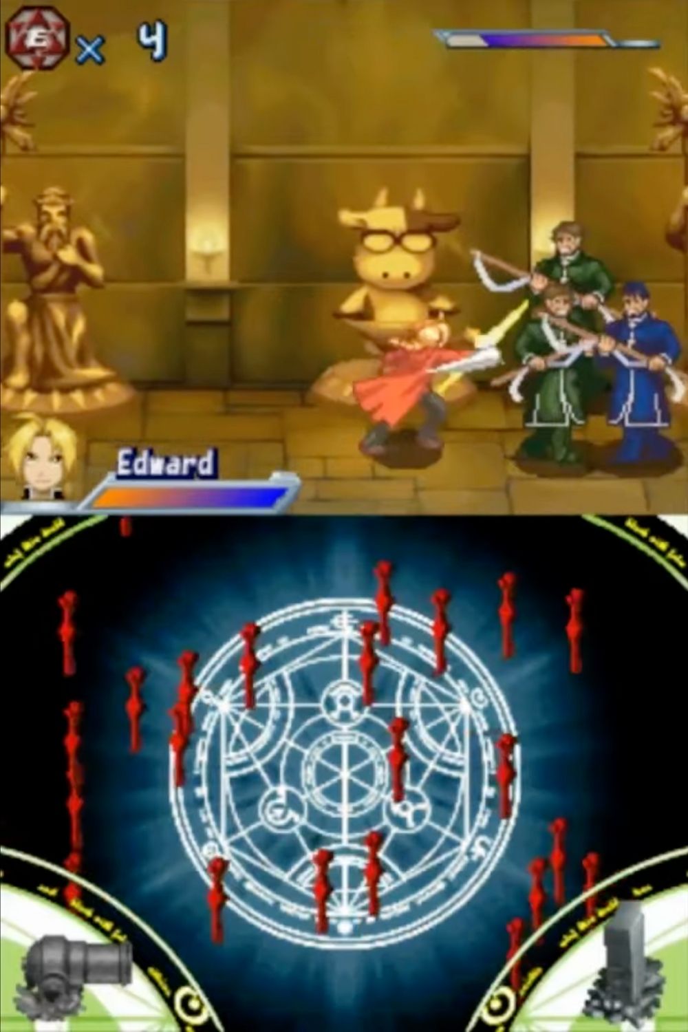 • Acquire special moves from six playable characters including Edward or Alphonse Elric, Roy Mustang, Alex Louis Armstrong, Izumi, and Scar