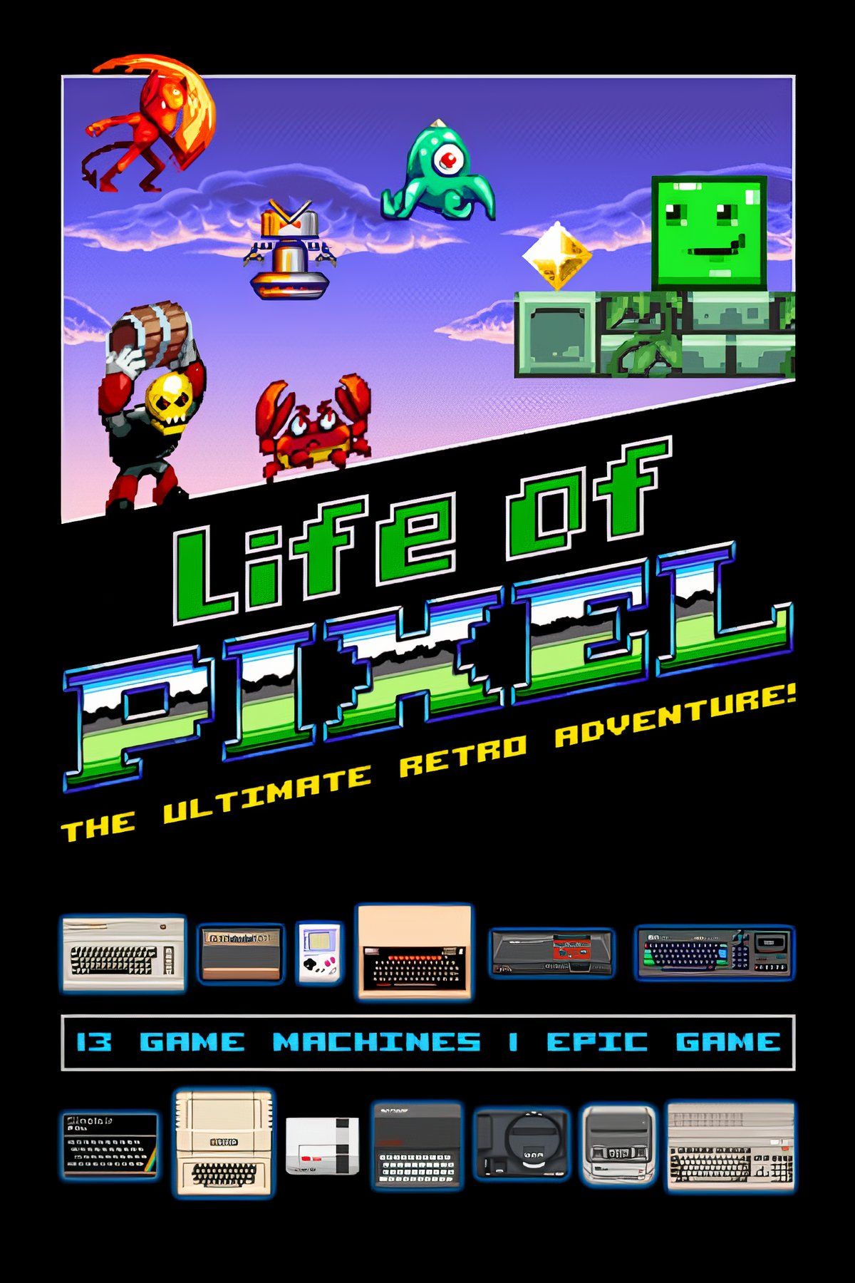 Take a journey with the wizened Professor Pixel and revisit the golden age of gaming. Featuring a massive variety of beautiful pixel art from classic 8 & 16-bit game systems, such as Amiga, SNES, Mega Drive, Commodore 64, Apple II, Game Boy, NES, Atari 2600, ZX Spectrum & Master System!