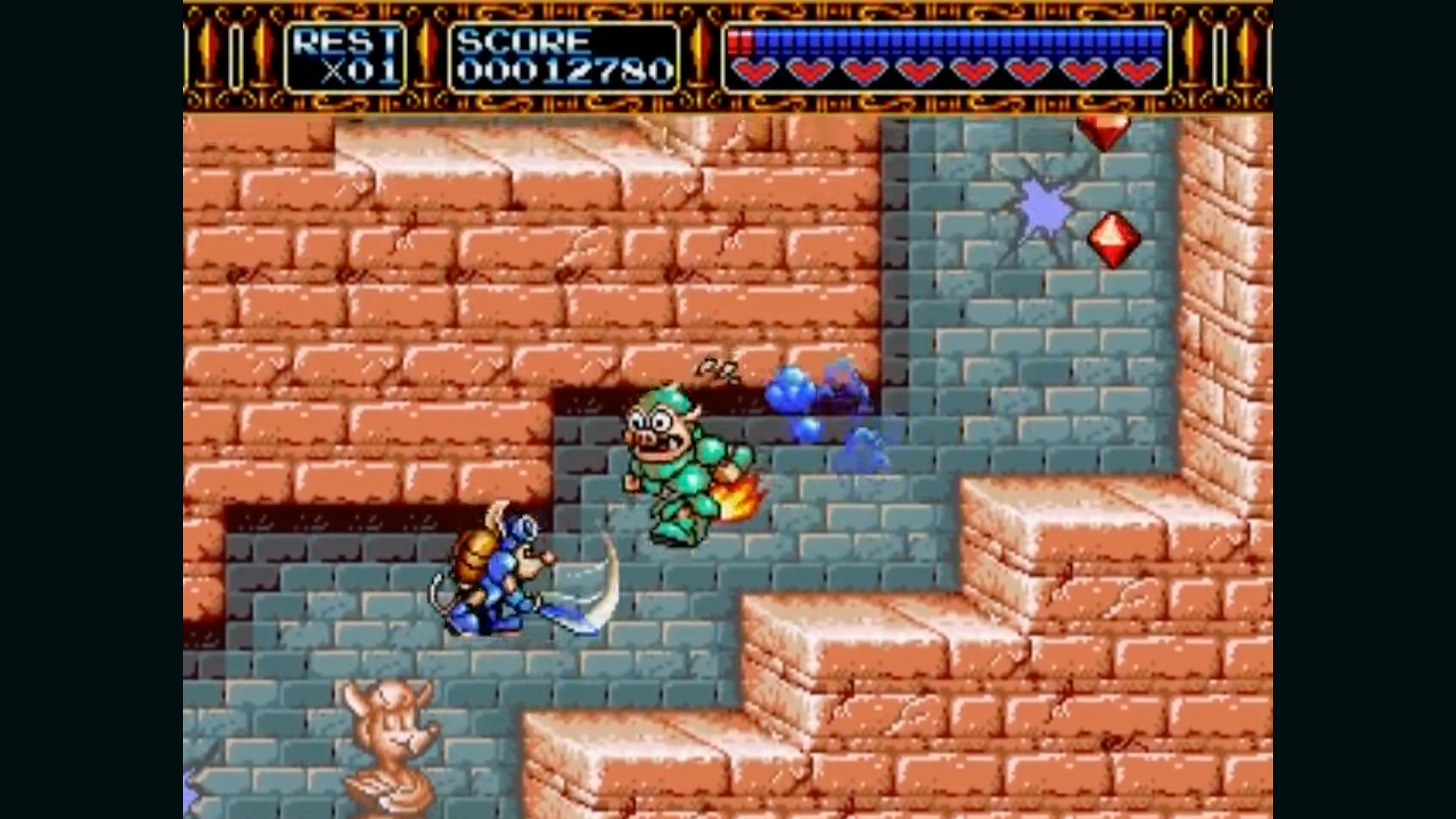 You're the thrust-miester controlling Sparkster's jet pack and his assault sword. Confront mechanized menaces like the Giant Pigbot, the Drill Of A Lifetime, and the snappy Crab Rangoon. Things take a turn for the worse in the room of rotating gravity where Axle Gear, the Black Knight awaits you. And you've never seen anything like the unreal mirrored lava pools where things will reflect badly on you. The tricks, traps and challenges never end. But the world as you know it will if you don't grind those pigs into sausage.