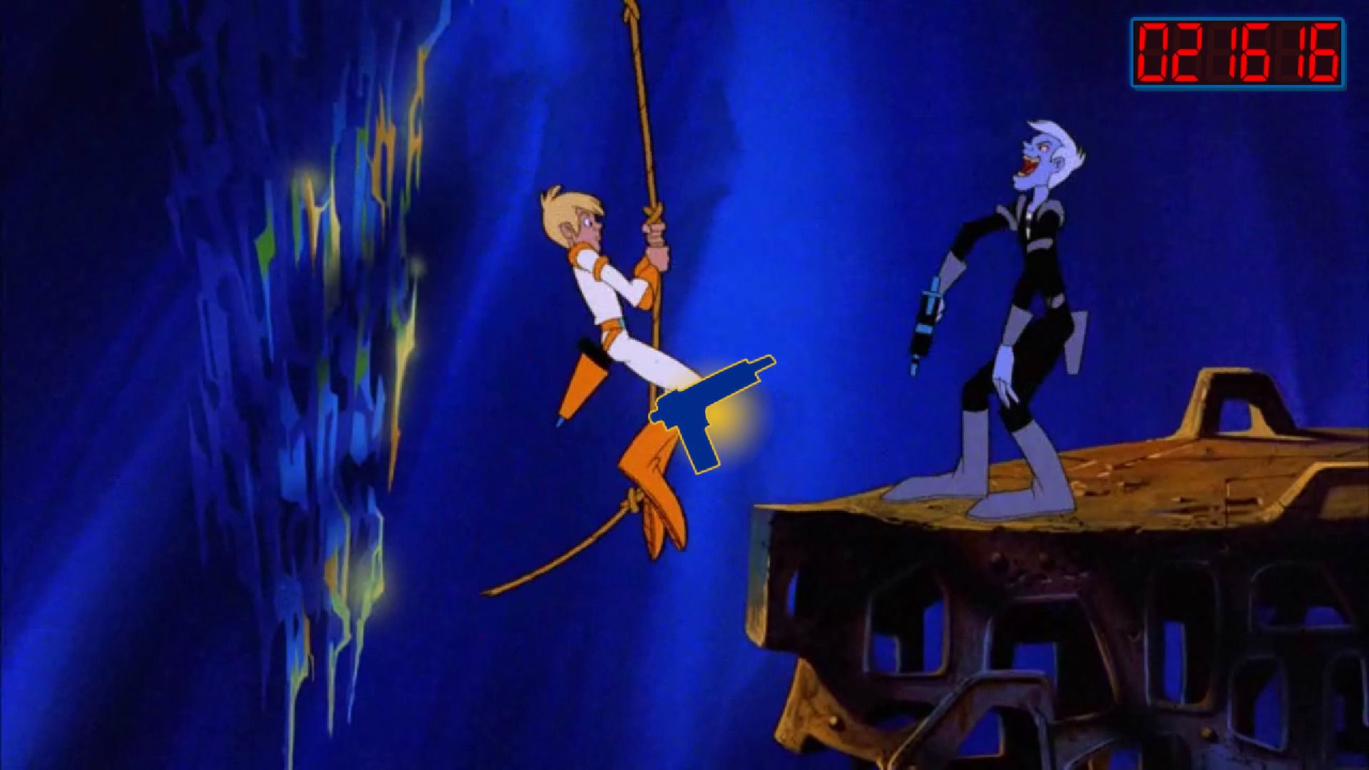 In Space Ace you play the heroic Ace who must stop the evil Commander Borf from taking over the Earth! Borf plans to reduce all of humankind to infants and take over the planet. Only two people have the courage and strength to stop Borf and save Earth: the beautiful Kimberly and the heroic Ace. But as they approach Borf's stronghold, Ace is hit by the Infanto Ray, changing him into a child, and Kimberly is kidnapped by the evil madman!