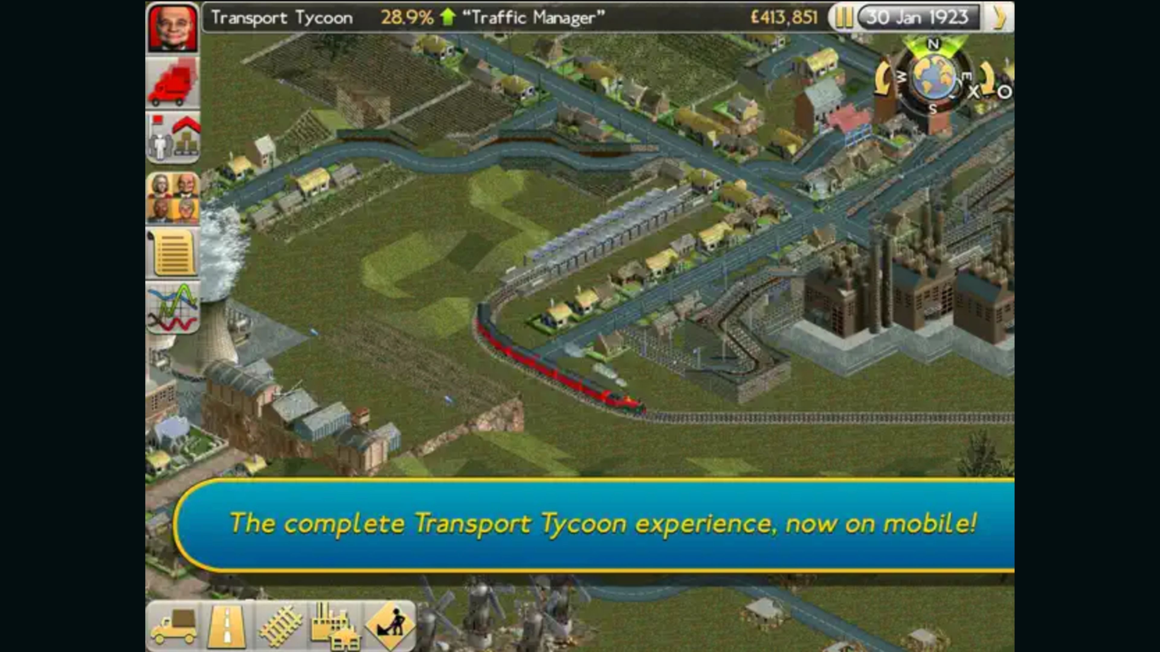Transport Tycoon contains everything that made the original PC game an all-time classic, plus a whole host of brilliant new features - bigger, richer worlds, deeper simulation and a huge variety of land, sea and air vehicles. The intuitive new touch screen interface makes it easier than ever to build and maintain your transport network.