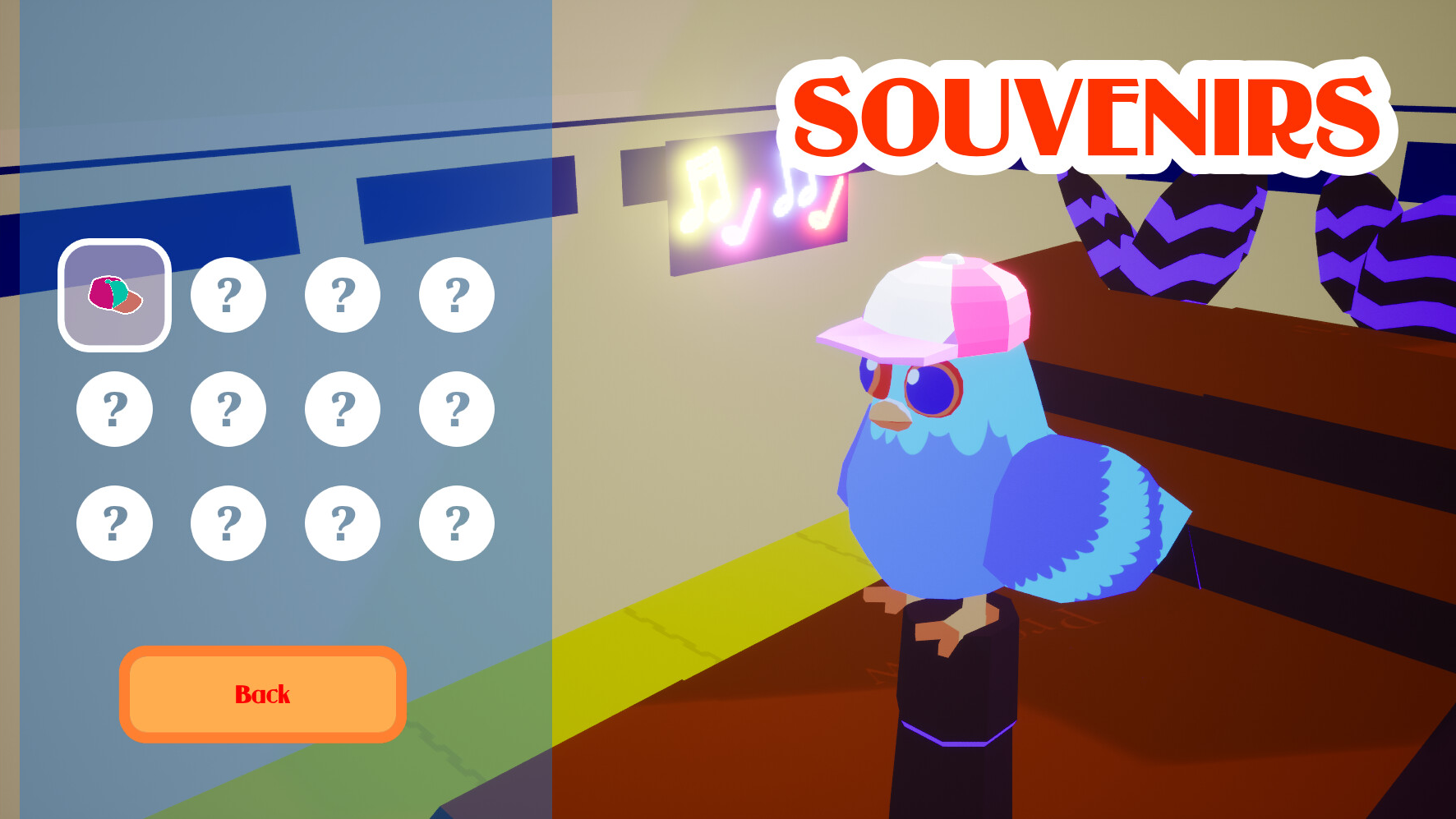 Pickup Souvenirs: Collect all the souvenirs. These style the pigeon in cute and fashionable ways while also providing extra defense from enemies.