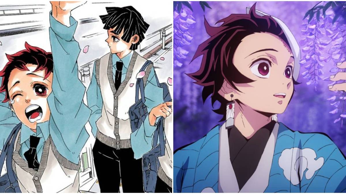 After opening up the reader to the various reincarnations that would make their debut in this chapter, Kanata and Sumihiko Kamado are the first to appear. By their similar appearances to previous characters, it is clear they are Kanao and Tanjiro, respectively. Both are headed to school, although Sumihiko sleeps in while Kanata tries to wake his brother up.