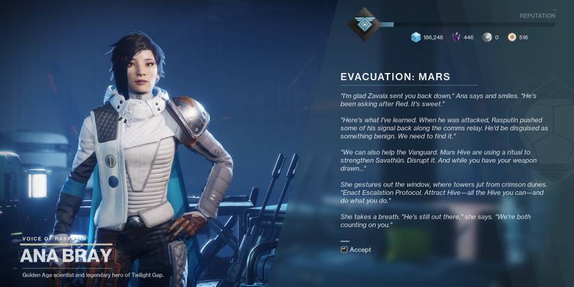 Ana Bray is still doing her best to get Rasputin back online. She has devised a plan to bring Rasputin to the Tower. While she is working on her plan, she will ask the player to do some general activities on Mars to help out the Vanguard. Unlike previous planets, there are no strikes tied to the next step.
