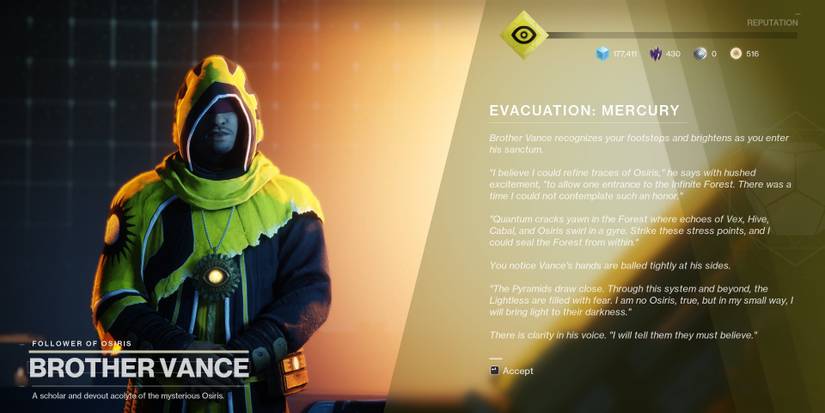 Brother Vance is as delusional as he's ever been. Even during the invasion of the Darkness, Vance is still trying to control the Infinite Forest and please Osiris. While he seems unwilling to leave Mercury at all, players are still forced to help him for the next step.