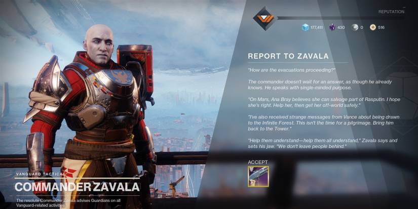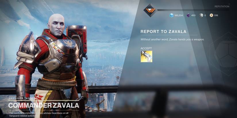 Despite the player's best efforts, only Ana Bray is willing to move away from her post and return to the Tower. Zavala will contemplate his past decisions when players talk to him. Once his monologue is done, he will give players the Exotic Traveler's Chosen, a repaired version of the pistol players start with during the Red War campaign.