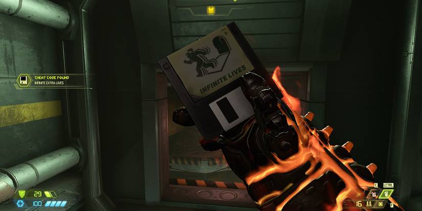 The first one is of course, in the first level. Most players probably stumbled upon it themselves. But, just in case you didn't, all you have to do is play through the intro level naturally until you first encounter the tentacles that randomly pop out of the floor. Once you get to the other side of that corridor and before you go up the stairs, look around for a box, hop on top, get into the vent, follow it around, and there you go! This cheat quite obviously gives Doom Guy infinite extra lives, though respawning right into another attack is one of the things the game needs to fix soon.