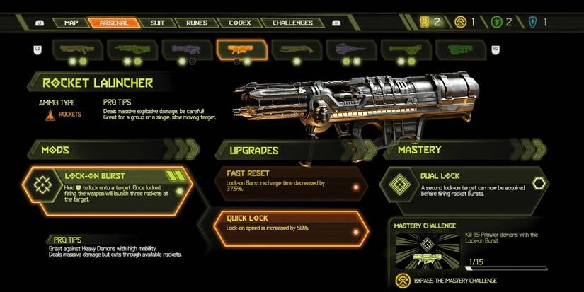 The rocket launcher’s Lock-On Burst upgrade is very powerful to use against the game’s beefiest demons. As its name suggests, it shoots out three rockets to a target that you’ve locked on to. Upgrading it shortens the lock-on time.
