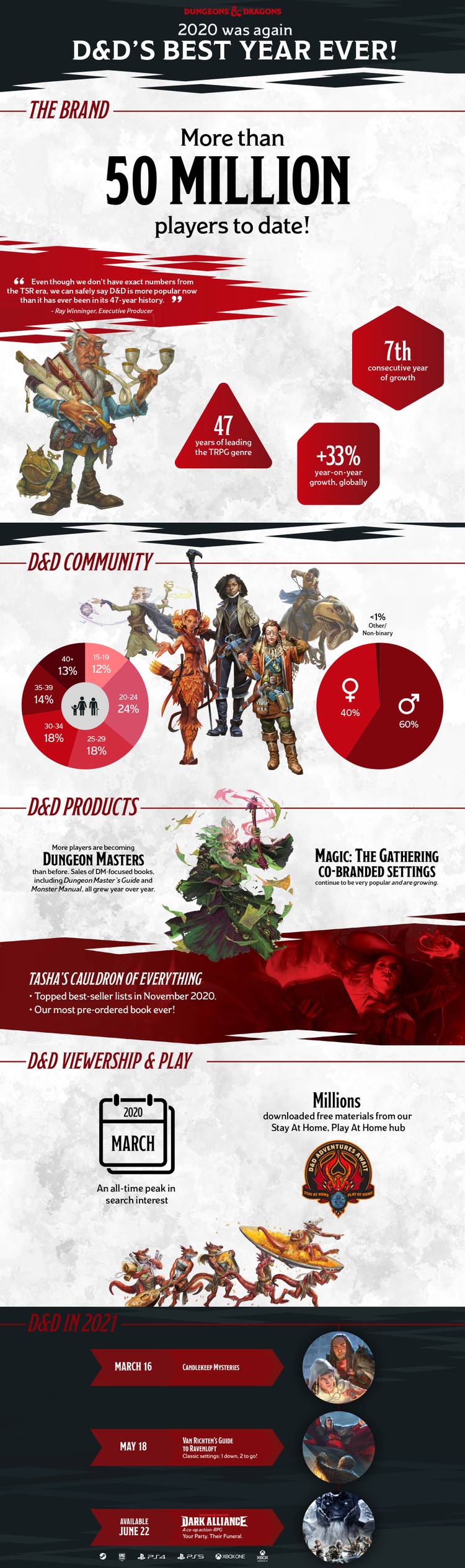 It's hard to deny Dungeons and Dragons' rise in popularity over the past few years. While the game has maintained a constant presence for decades, it's experienced a jaw-dropping amount of growth, etching out a spot as the quintessential tabletop game. A new infographic released by Wizards of the Coast shows just how popular the game was in 2020.
