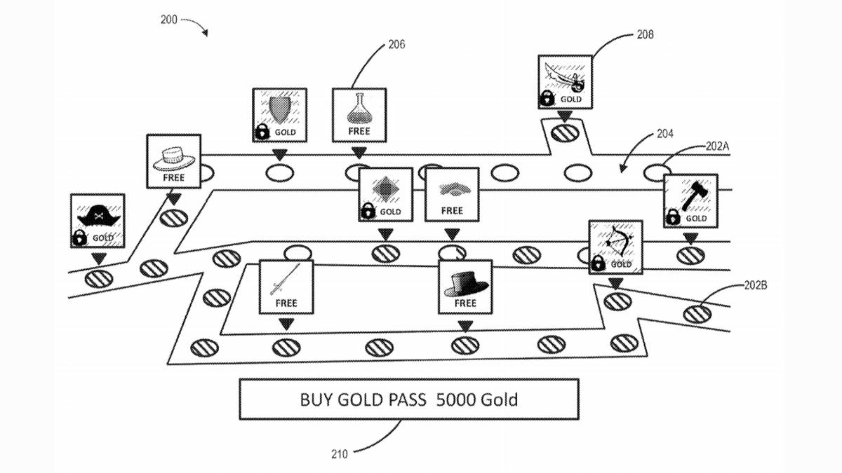 The Electronic Arts patent application was published on May 13 and is titled "Seasonal Reward Distribution System," basically a generic description of battle pass. This specific design is notable in that it describes a "non-linear map" for the pass, with player-choice being a focus rather than a singular progression track. At its simplest, the map is made up of multiple pathways or tracks lined with nodes that players can choose as they desire. Each node grants a reward and a node unlock is granted as players level up their characters or accounts.