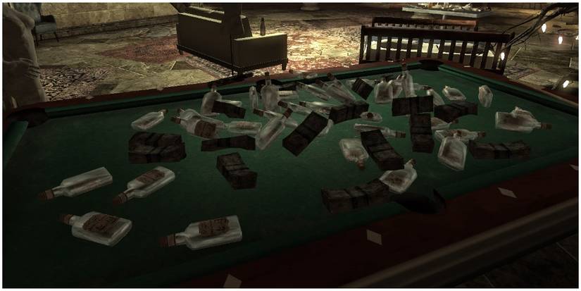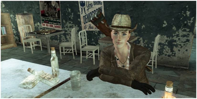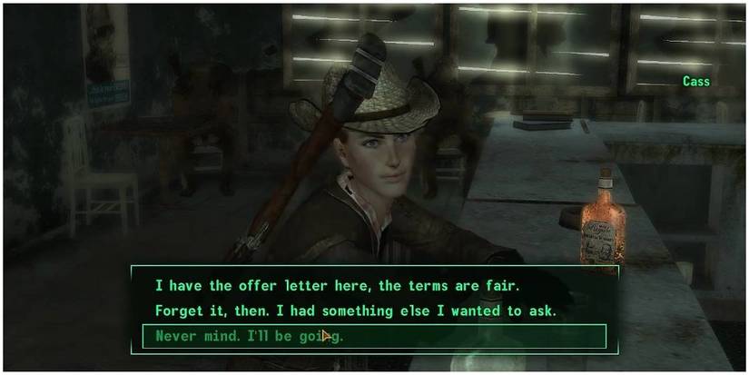 Cass enjoys drinking quite a bit, and players can challenge her to a drinking game. Having at least 6 endurance will cause the Courier to lose, but Cass will compliment them on their fortitude. If they have 8 Endurance or higher, there can be another outcome.