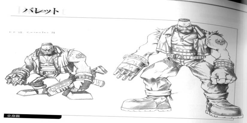 Unlike Cloud's piece of concept art which evidently showed him fairly early on in development, this piece of concept art depicting Barret is fairly close to his final design– if not his final design outright, simply in black & white. Interestingly, this only applies to Barret's full body model. To the left is what appears to be an earlier version of Barret, albeit one fairly close to the final design.