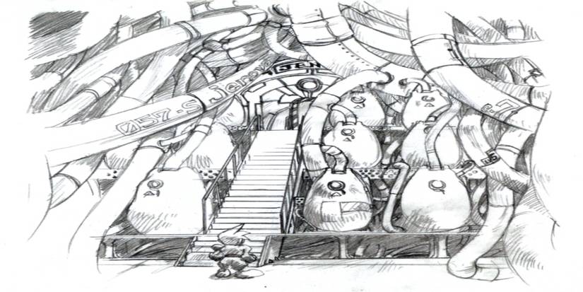 There's so much more to concept art than character and setting design. Final Fantasy VII in particular has a few pieces of concept art depicting scenarios in-game. This one notably features Cloud's confrontation with Sephiroth– or so he thinks– at Nibelheim. Sephiroth is nowhere in sight, with Cloud standing before the now iconic staircase.