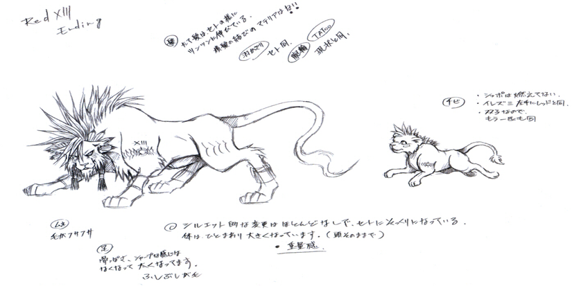 This piece of concept art depicts Red XIII as seen 500 years in the future, along with one of his cubs. He very much resembles the statue of his father, Seto, but it's just as possible Red XIII's adult form was designed first with Seto's statue instead based on his son. This is pure speculation, though.