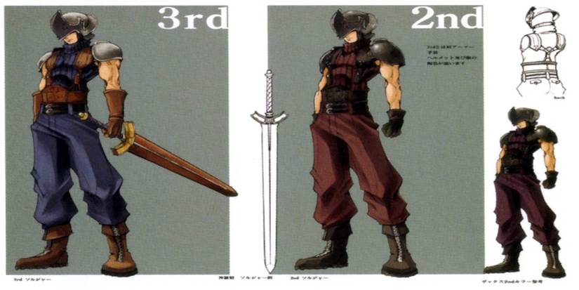 Unlike other pieces of concept art features, the SOLDIERs depicted here look more or less done on a design level. There are also very little changes between these designs and the final in-game designs. The only key difference between a SOLDIER 3rd Class and Cloud ultimately comes down to the shoulder guards.