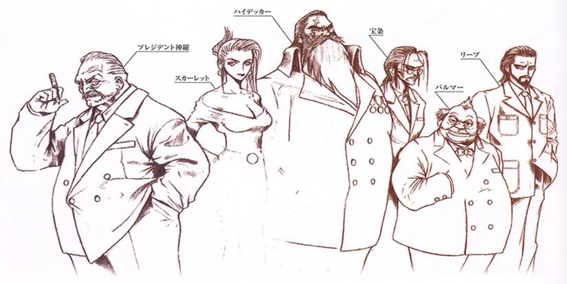 In practice, the Shinra Execs end up fulfilling wildly unique roles. President Shinra is killed by Sephiroth as an antagonistic passing of the torch; Scarlet and Heidegger swap back & forth serving Rufus' orders; Hojo ends up being the real threat at Shinra; Palmer is pure comic relief; and Reeve joins the party via Cait Sith.