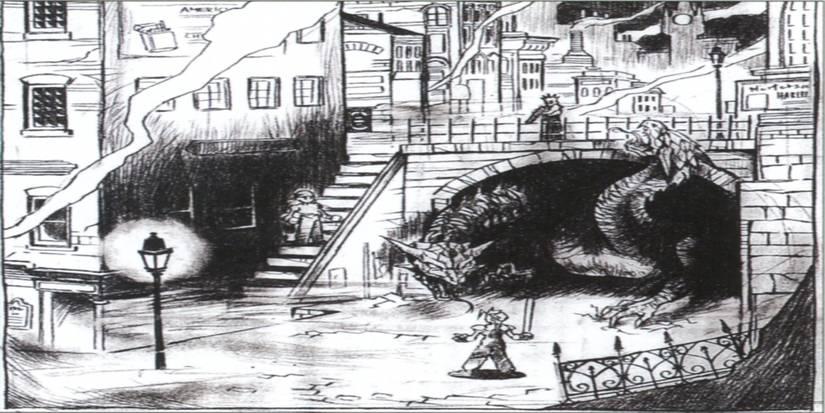 Believe it or not, Final Fantasy VII was envisioned as a mystery story with a New York-esque setting very early on in development. This might not only help explain Midgar's aesthetic, but also this piece of early concept art depicting Midgar on ground level. While a bit more contemporary than the Midgar FFVII settles on, the inclusion of a dual headed dragon coming from under the bridge is an interesting touch.