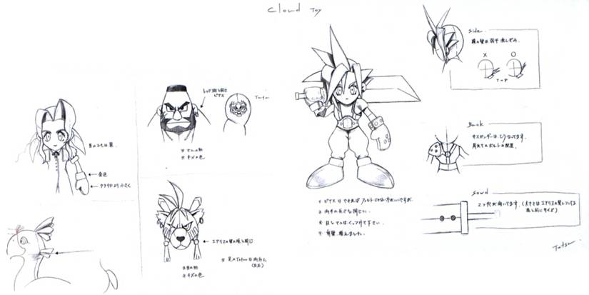 To put into perspective how early this piece of concept art must have been designed one only needs to look at Cloud dead center. Not only are his hair and sword not finalized, Cloud appears to be wearing two shoulder guards instead of one.