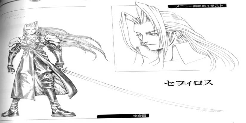 As is the case with Barret's concept art, this piece depicting Sephiroth is more or less finished. There are no meaningful differences between concept art Sephiroth and final game Sephiroth, his portrait for when he's briefly a party member even included as is in the final game. That doesn't mean this piece of concept art isn't telling, however.