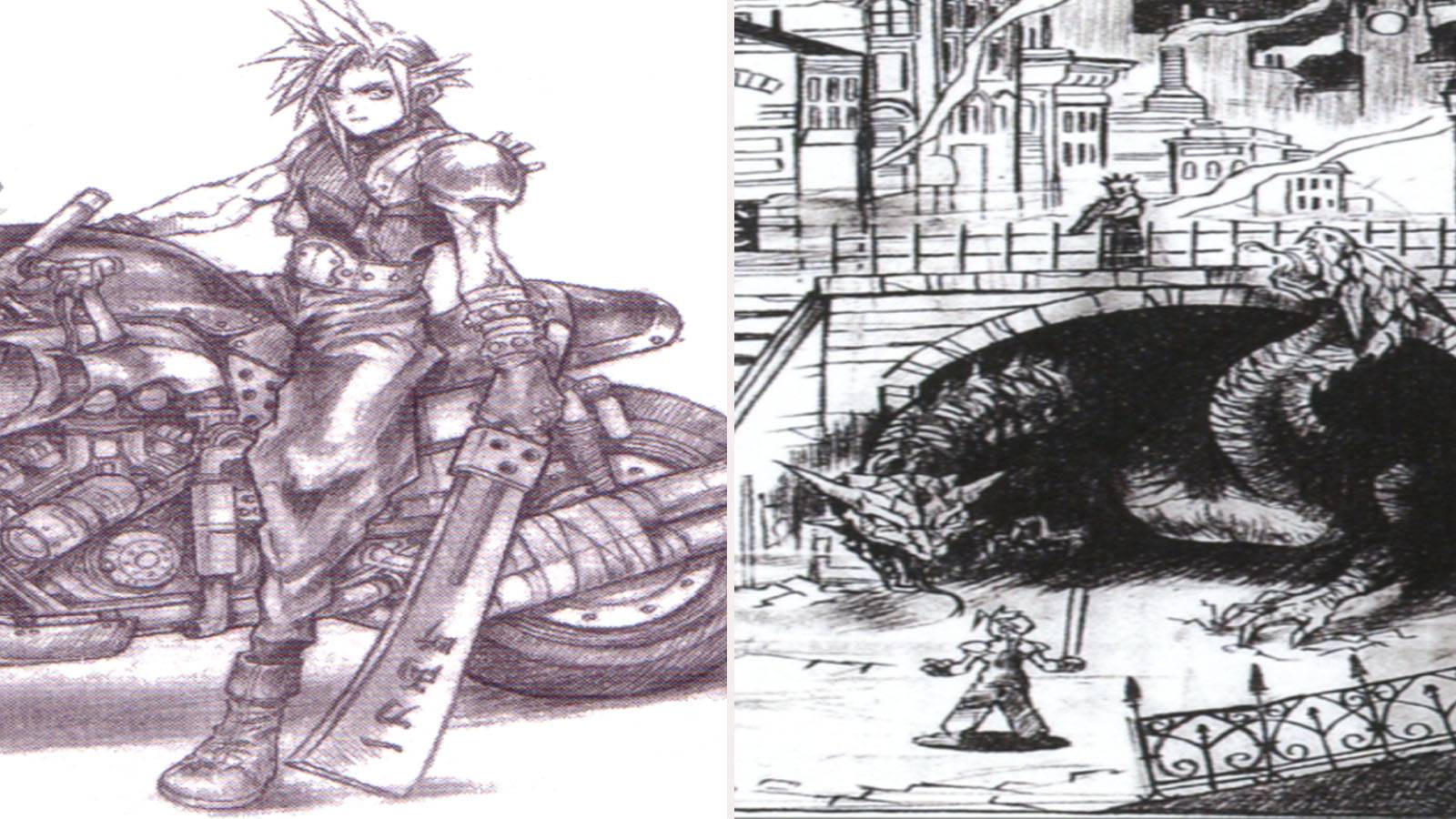 Worth noting, this sketch actually appears to be concept art for a CG render of Cloud on the Hardy Daytona, not Final Fantasy VII proper. Instead of the Buster Sword, Cloud is equipped with Hardedge (a detail which carries over to the final render itself.)