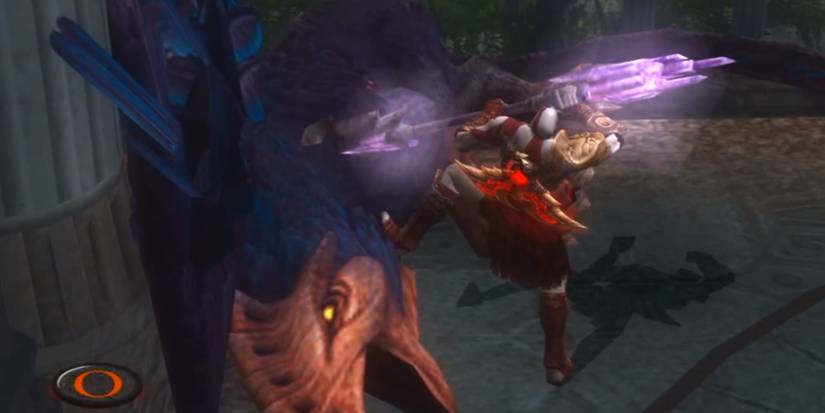 This weapon is from God of War 2 and can be obtained from killing the Dark Rider, the leader of the Griffin Riders, who also wields the Spear of Destiny. Kratos kills him by impaling him and his dark Griffin with his own weapon, and they plummet to the ground. Later on, the corpse of this mount is found, but it's rider body nowhere to be seen and Kratos recovers the Spear of Destiny.