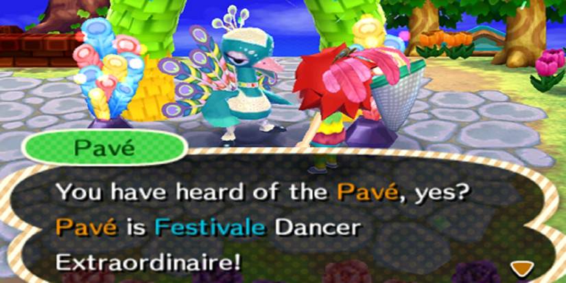In New Leaf, Festivale is more involved, as each resident dresses up for the occasion in an elaborate headdress and challenges the player to a range of simple games (such as Rock, Paper, Scissors). In a similar fashion to Bunny Day, there are a range of feathers of different colors to collect (use a net to nab them as they drift by) and giving Pavé the right combination of them will yield an item from the Pavé set.