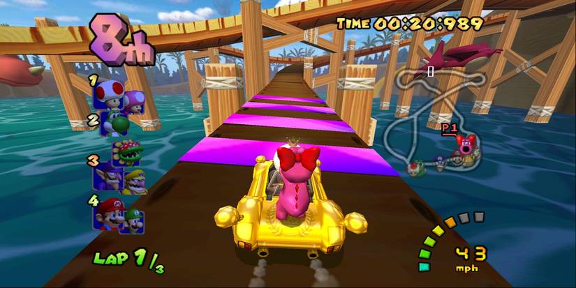 In terms of the layout, the track is simple enough: long straights and fairly simple bends in an almost triangular shape. Inside the rickety mine itself, though, there are tons of narrow paths to plummet to your doom from. Not to mention the Swoops, the most infuriating video game bats since the Zubat that attack you every eighth of a second in Mt. Moon.