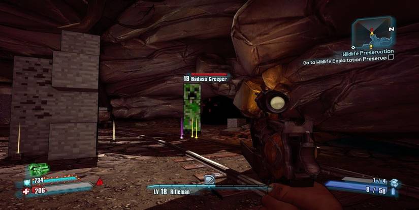 Minecraft fans will recognize this as a small wall made of the pixelated blocks found in that game. Breaking these blocks will lead you to a mineshaft, where you'll find resource blocks that yield Eridium, as well as sauntering Creepers. Yes - those pesky little explosive green guys are hanging out in here! Be careful, though, because they do explode in true annoying Creeper fashion. Killing these will grant an amusing skin of this baddy, which makes for a cool little collectible.