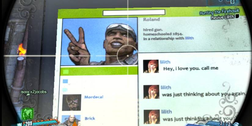 During the mission of Borderlands 2 in which you enter the Firehawk's lair, you'll see a myriad of computer monitors that encircle the boss location. If you look hard enough, you'll notice a Facebook page of one of BL's main heroes, with an avatar of him grinning and flashing a peace sign. You can also see that Lilith has left a few rather enthusiastic comments on Roland's page.
