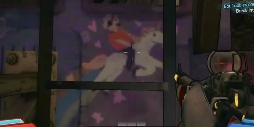 During the amusingly titled "Eat Cookies and Crap Thunder" mission, you'll find Tiny Tina inside a broken-down bus. On the back of the bus, you might have noticed an odd image featuring a grey-haired man riding a Unicorn, before likely murmuring "huh?" It turns out, this is an obscure reference to a gaming-related youtube show in which Anthony (one of the game's writers) and his sister Ashly collaborated on, called Hey Ash, Whatcha Playin'? The episode in question closes out with their father sporting an eye patch and growling "Metal Gear."
